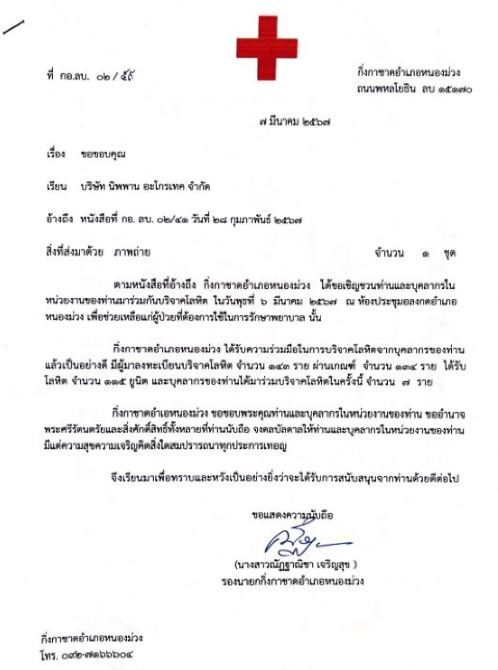 กิ่งกาชาดอำเภอหนองม่วง ขอขอบคุณ บุคลากร บริษัท นิพพาน อะโกรเทค จำกัด ที่มาร่วมบริจาคโลหิต ให้กับหน่วยงาน ถึง 7 ราย เพื่อช่วยเหลือแก่ผู้ป่วยที่ต้องการใช้ในการรักษาพยาบาล ครั้งนี้มีผู้ประสงค์เข้าร่วมบริจาคถึง 143 ราย ผ่านเกณฑ์ จำนวน 134 ราย ได้รับโลหิต จำนวน 115 ยูนิต