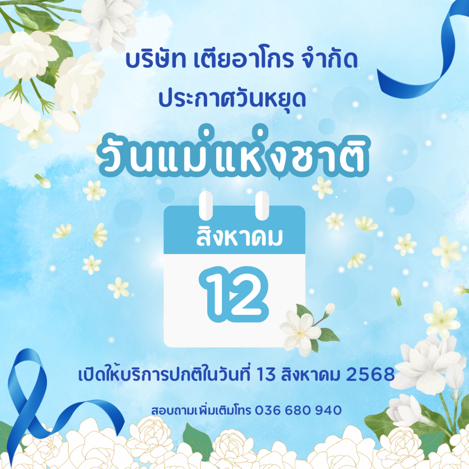 บริษัท เตียอาโกร จำกัด หยุดวันที่ 12 สิงหาคม 2568 เนื่องด้วยวันแม่แห่งชาติ